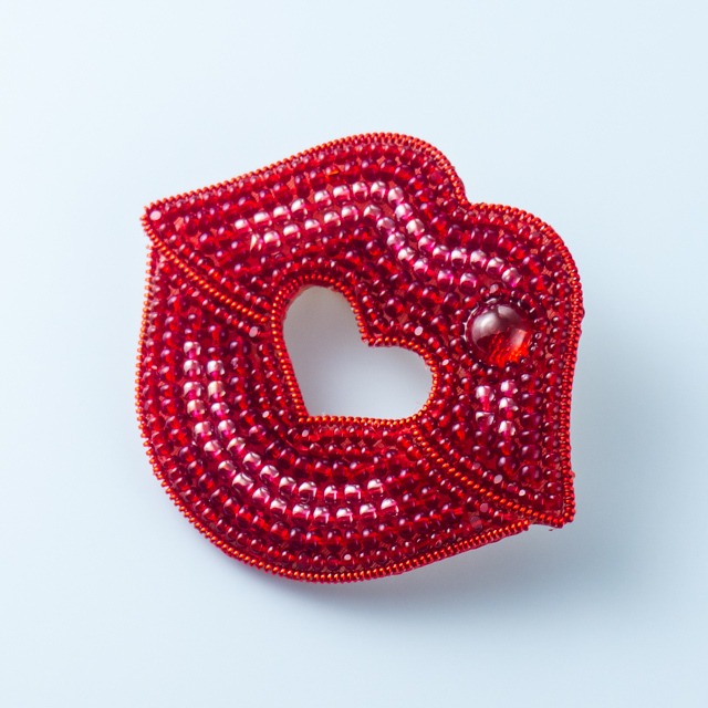 CHU!(チュッ)としたときの唇がモチーフのビーズ刺繍ブローチです。 こちらは2021年制作の現品(画像の品)のお届けになります。 唇モチーフはたくさんありますが、唇の中がハートになっているのがポイントのオリジナルデザインです。 CHU!(チュッ)とした唇からハートのビームがくり出されて、相手の心をGYU!(ギュッ)とつかむイメージでデザインしました。 ガーネットのような深みのある赤のチェコ製ビーズをメインにして、大人っぽい仕上がりです。 ラスターという処理で光り方に強さがあるピンク系の日本製ビーズが唇の輝きを表現しています。 唇の中に置いたのは本物のモザンビーク産ガーネットです。 マリリンモンローの唇の近くにあるホクロをイメージして、色っぽさを醸し出してみました。 スワロなどのラインストーンではなく天然石を使ったのがこだわりで、品のある色気になったと思います。 黒や紺のハイゲージセーターや清潔感のある白T・ボーダーTなどにいかがでしょうか。 シンプルなキレイ目カジュアルにピリッと効かせるスパイスになります。 オートクチュールビーズ刺繍の特徴でもありますが重さは8.5g程度と軽めです。 トートバッグや帽子などにつけたり、スカーフ留めなどにお使いいただくのもおすすめです。 裏側はレジンで丁寧に仕上げています。 金具が溶け込むようにきらめきのあるゴールド色仕上げです。 -------- こちらもおすすめ↓ Heart Beam Lip ブローチ~メタリックレッド> https://lululunedi.theshop.jp/items/56241141 -------- ◇サイズ 約 49mm×40mm ◇厚み 約 5mm(ブローチ金具・ガーネット部分を除く) ◇重さ 8.5g程度 ◇素材 ビーズ モザンビーク産ガーネット(直径 約6mm) ワイヤー ブローチ金具(真鍮に金メッキ) レジン ※ビーズその他材料は、時間が経つにつれて酸化現象により変色・色落ちする場合があります。 ※ご入金確認後、通常土日祝日を除き2日前後での発送となります。 ご購入の前に下記のページもご確認ください。 お取扱い時のお願いと保管について> https://lululunedi.theshop.jp/p/00003 ショッピングガイド> https://lululunedi.theshop.jp/p/00001