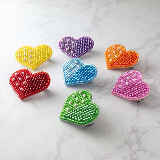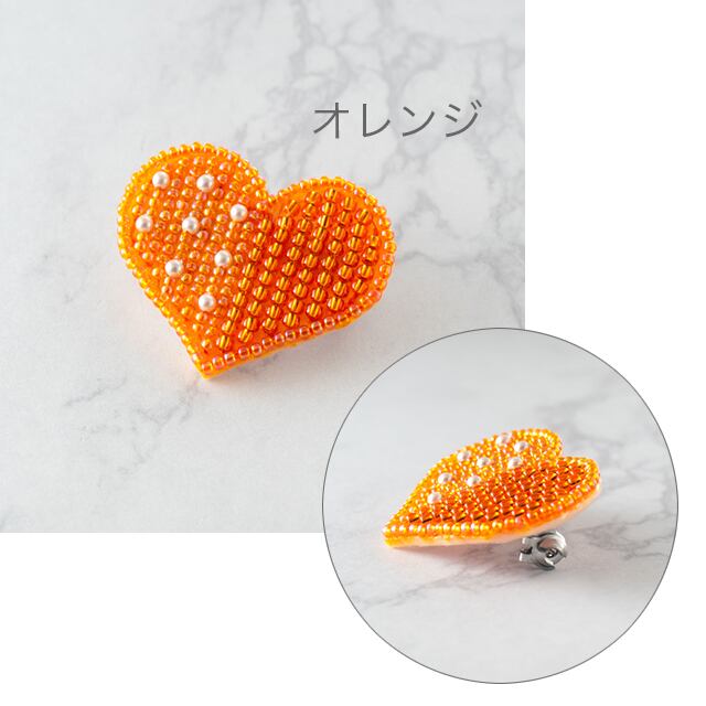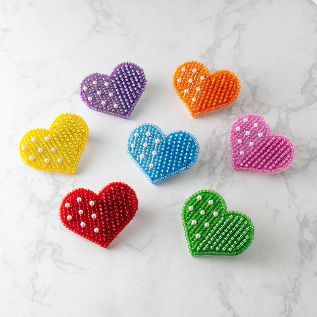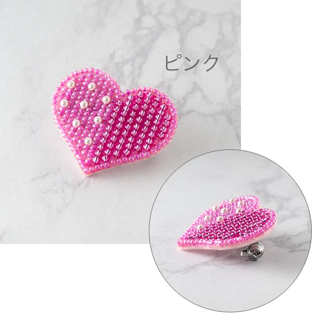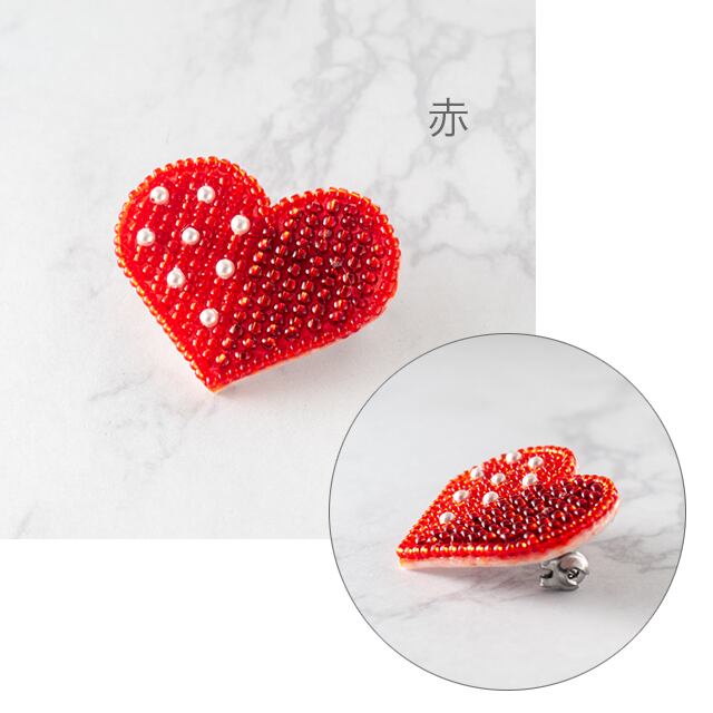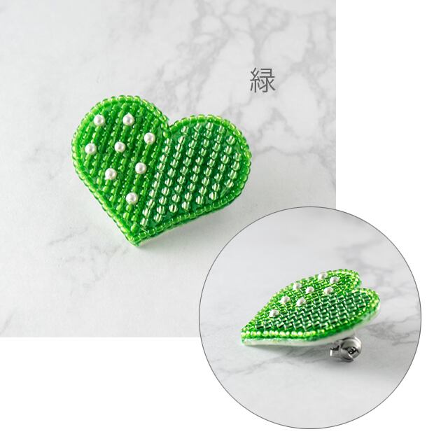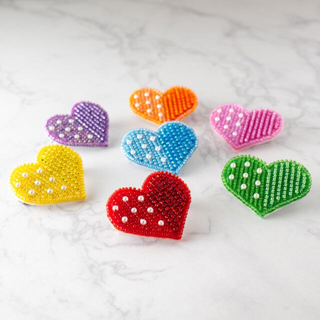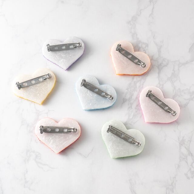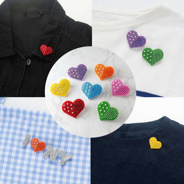 小さめサイズで服やバッグのキュートなポイントになるハートのブローチ、7色の中からお好きな1色をお選びいただけます。