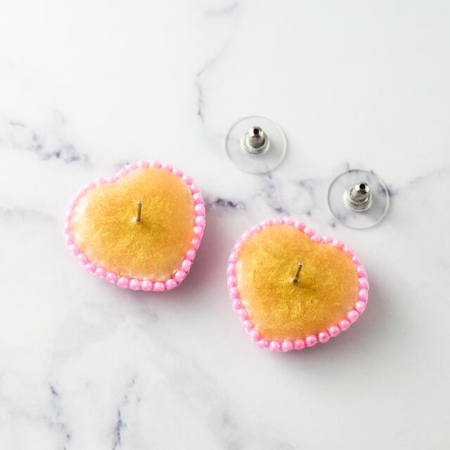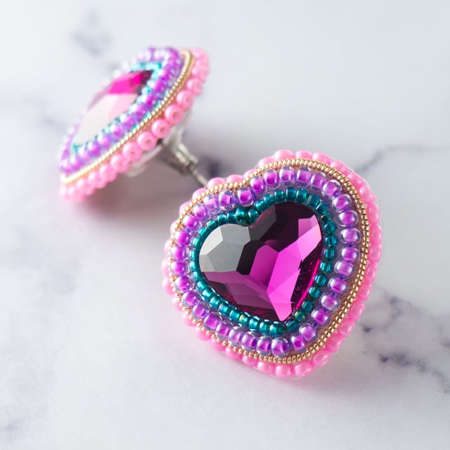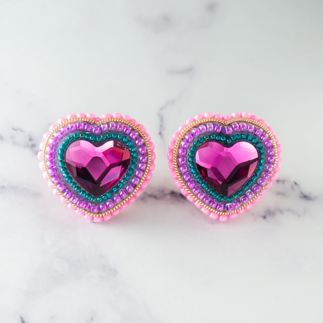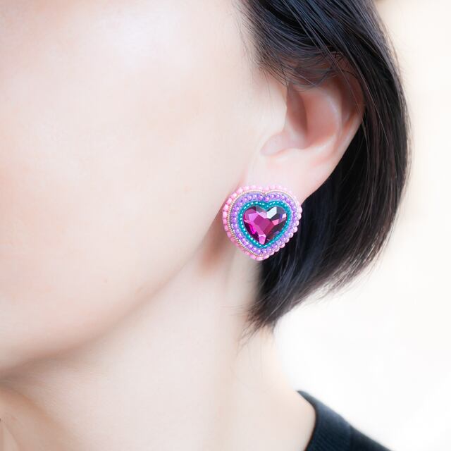 心が弾むような大きなハートのラインストーンが輝く、ビーズ刺繍のピアス。