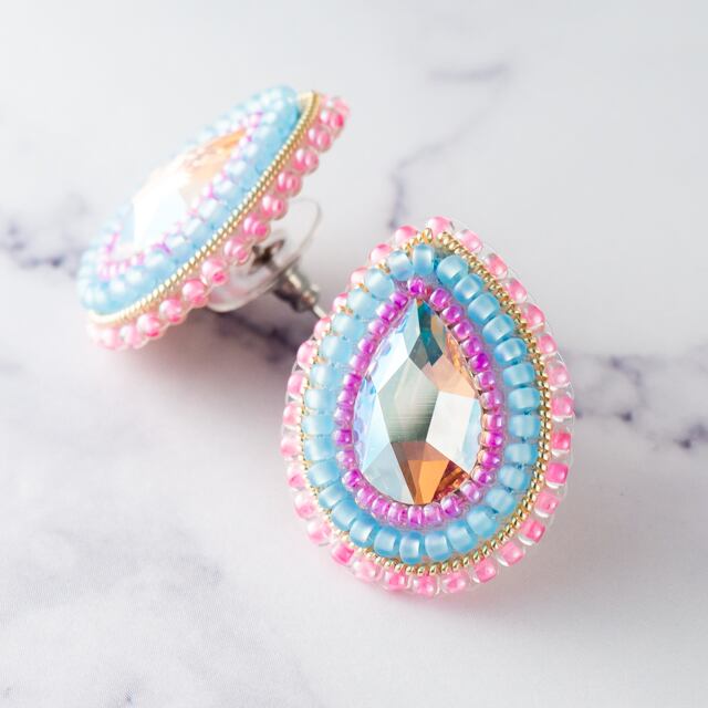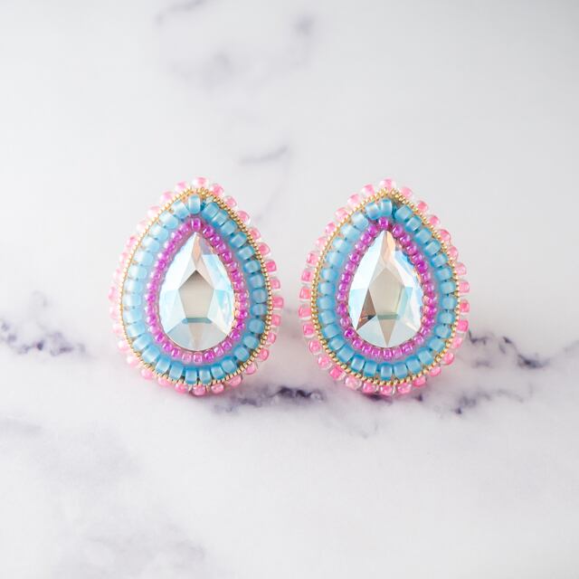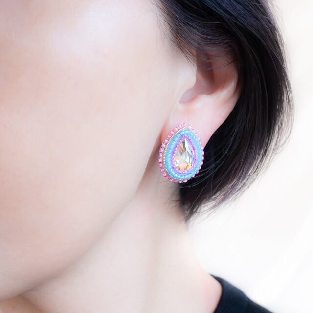 不思議な輝きを放つドロップのラインストーンが輝く、ビーズ刺繍のピアス。