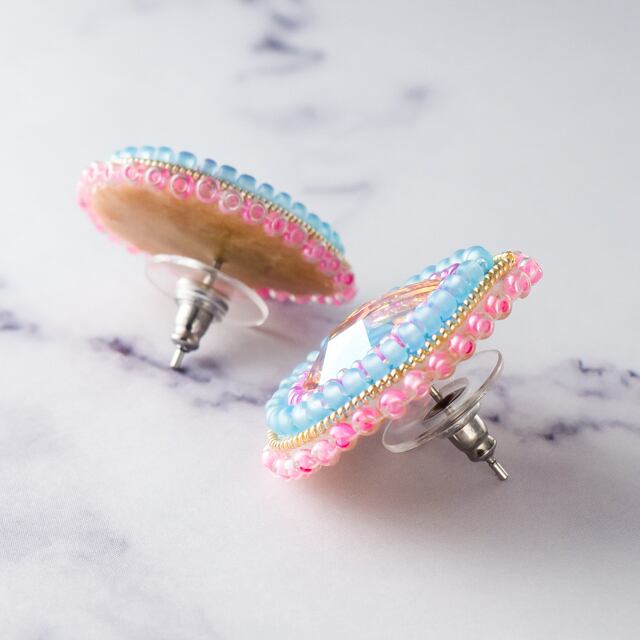 色だけ聞くと甘い印象ですが、すりガラスのようなつや消しで半透明の青をメインに持ってきているので、含みのある大人スイートなピアスに仕上がりました。