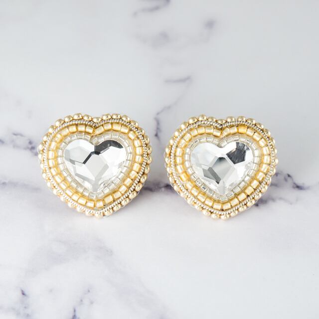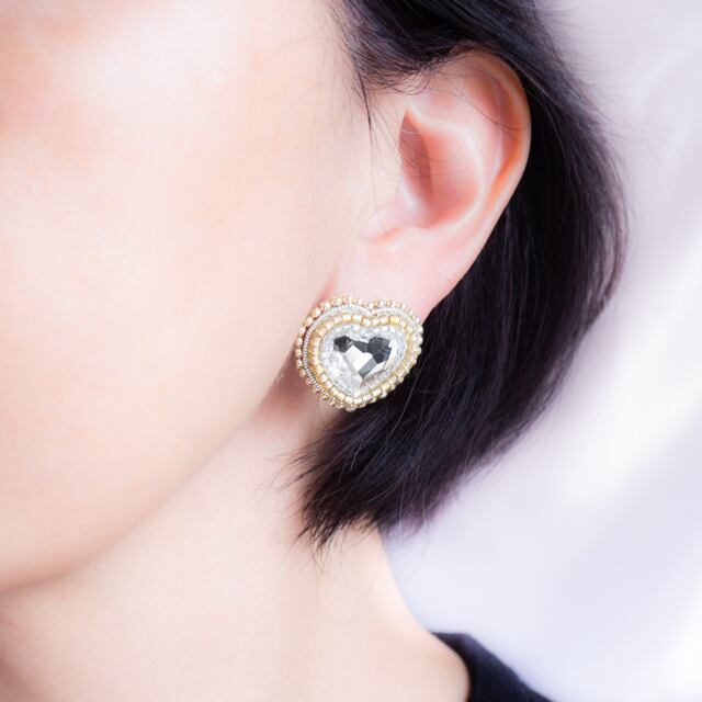 心が弾むような大きなハートのラインストーンが輝く、ビーズ刺繍のピアス。