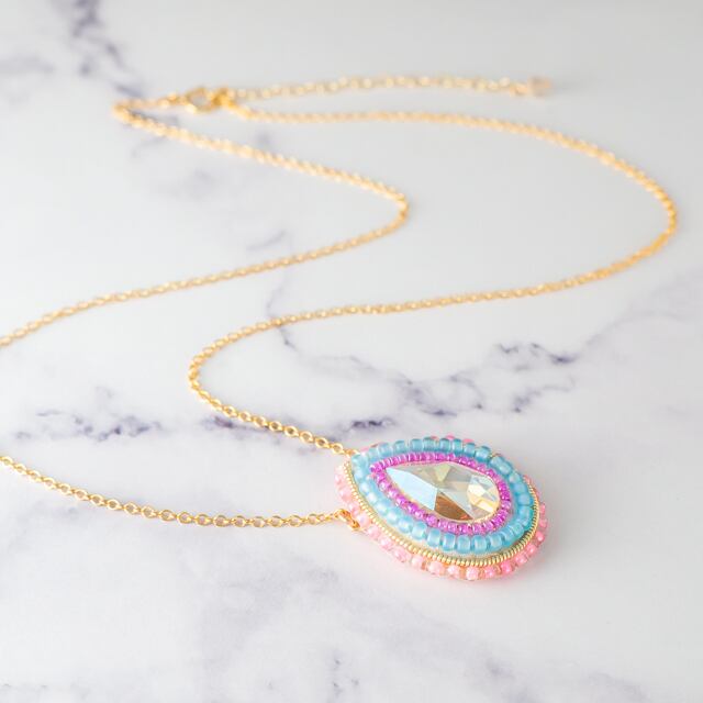魅惑的なラインストーンの周りにはパープル・ライトブルー・ピンクのビーズで刺繍を。