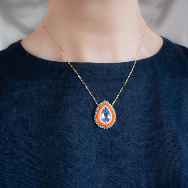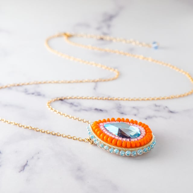 シックな色合いのラインストーンの周りには、くっきりとした色合いのオレンジのビーズを優しいピンクと水色のビーズではさんで刺繍しました。
