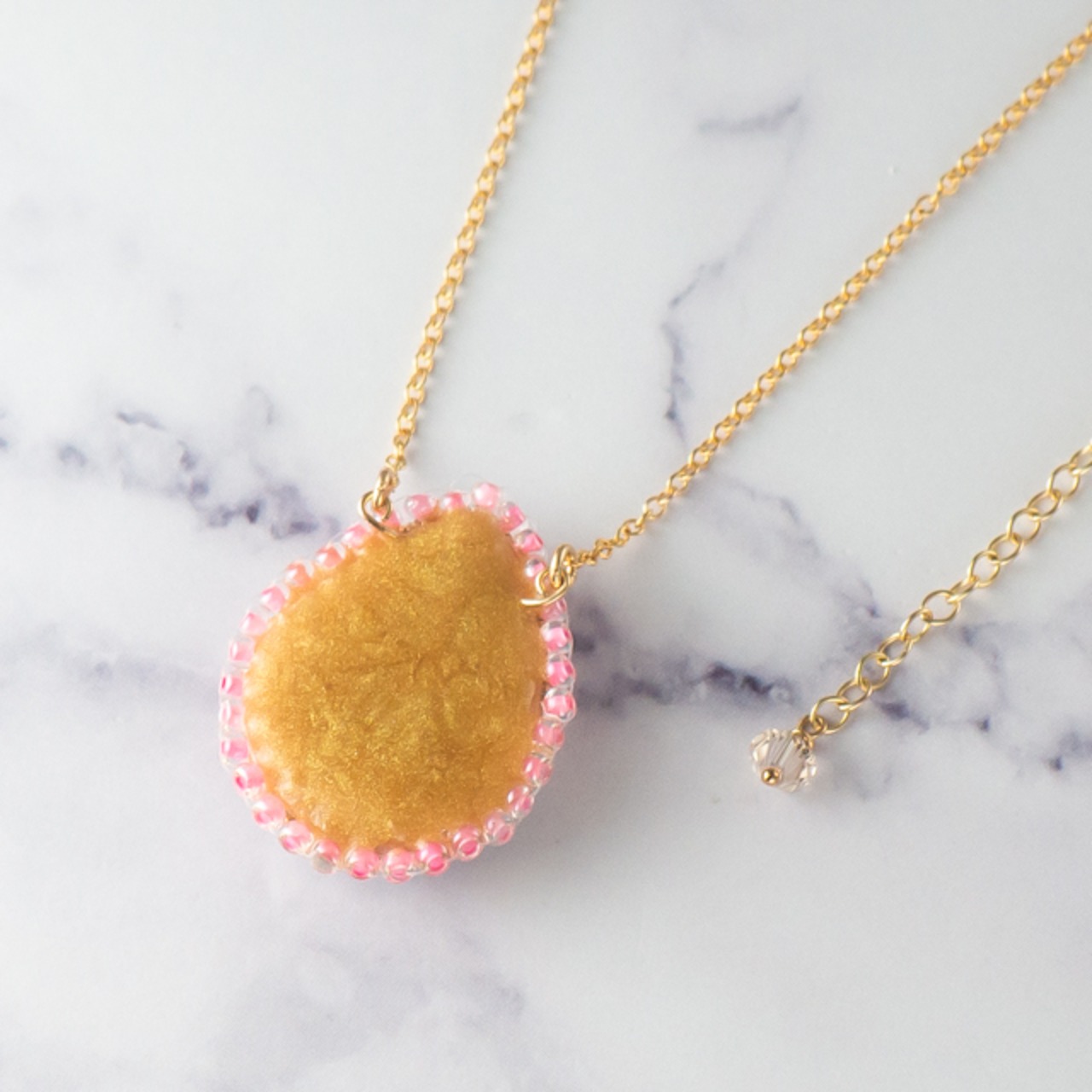 メインのオレンジ・ビーズはつや消しを使うことでしっとりさせ、子供っぽさを排除しています。