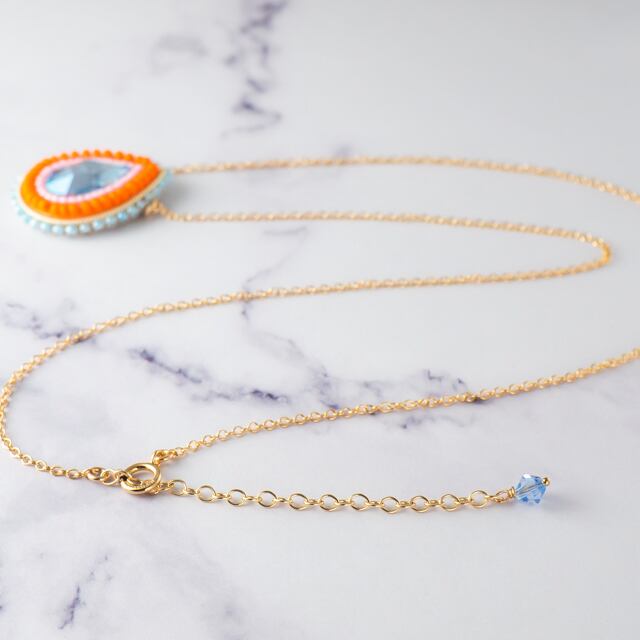 不思議な輝きを放つラインストーンのドロップが印象的で大人が楽しめるビタミンカラーのネックレス、現品限りで画像の品をお送りします。