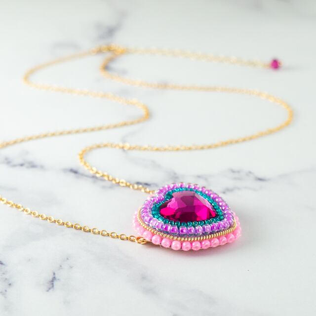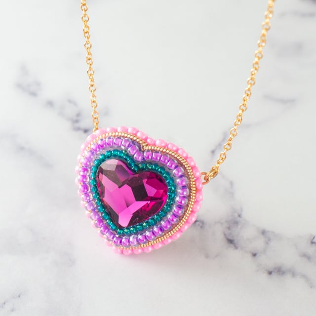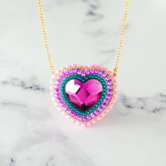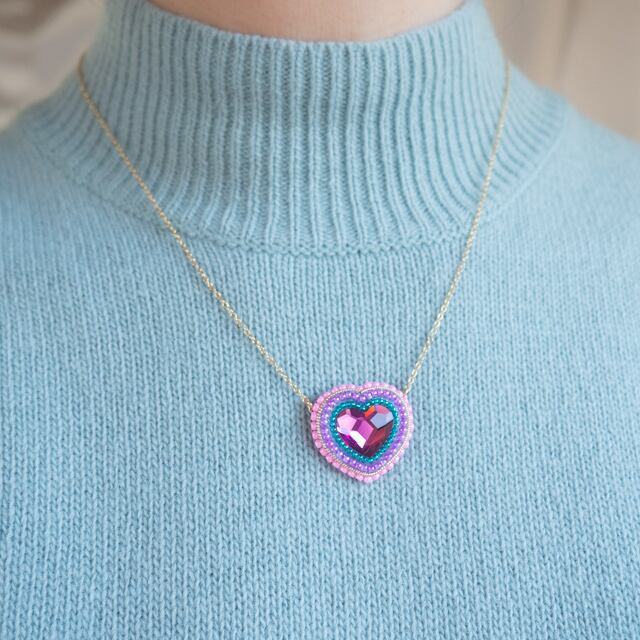 その濃ピンクのラインストーンの周りをまずキラメキ感のある、でも落ち着いた色合いのブルーグリーンのビーズで引き締めて、その隣を大人っぽさのあるパープルのビーズ、そして一番外側をちょっとマットで優しい質感のピンクのビーズで刺繍しました。