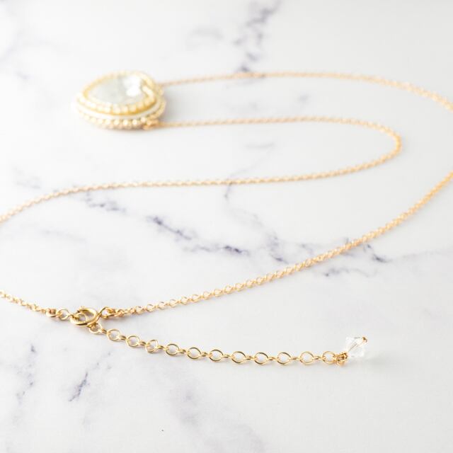 チェーンや金具は金メッキのギラギラしたゴールドだとこのチャームの品格に合わないので、ちょっと高価ですが本物の金の輝きが楽しめる14金ゴールドフィルド(14KGF)製にしました。