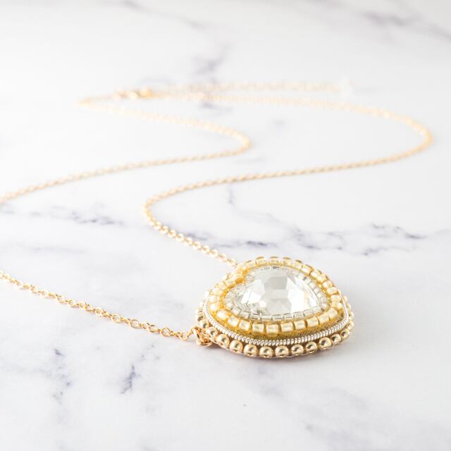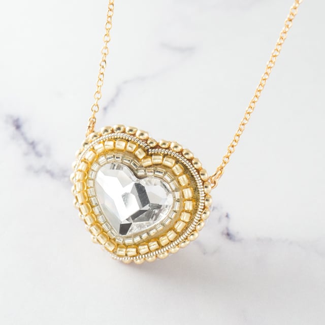 ベーシックなクリスタルカラーのラインストーンの周りに、何かと使い勝手の良いゴールド&シルバーのビーズを3種類組み合わせて刺繍。