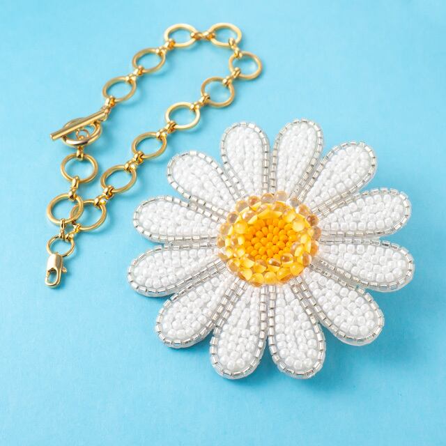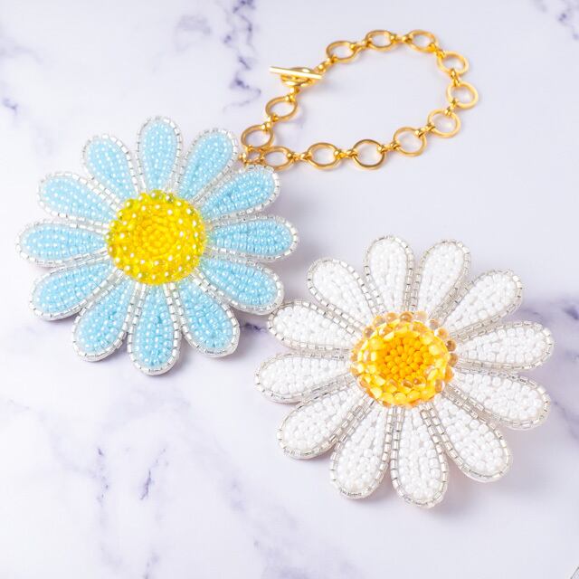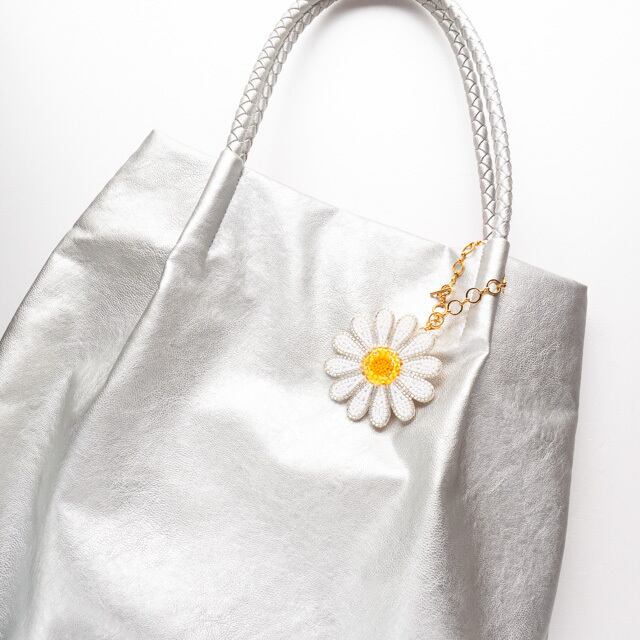 ちょっとポップで爽やかな、マーガレットのビーズ刺繍ブローチ兼バッグチャームです。