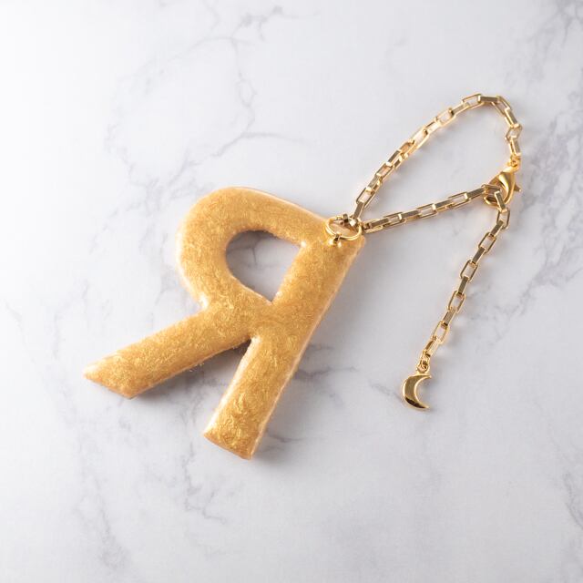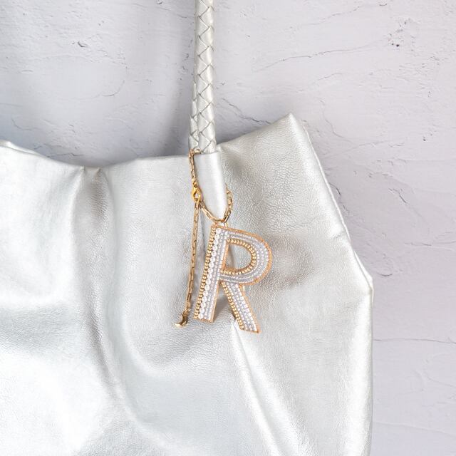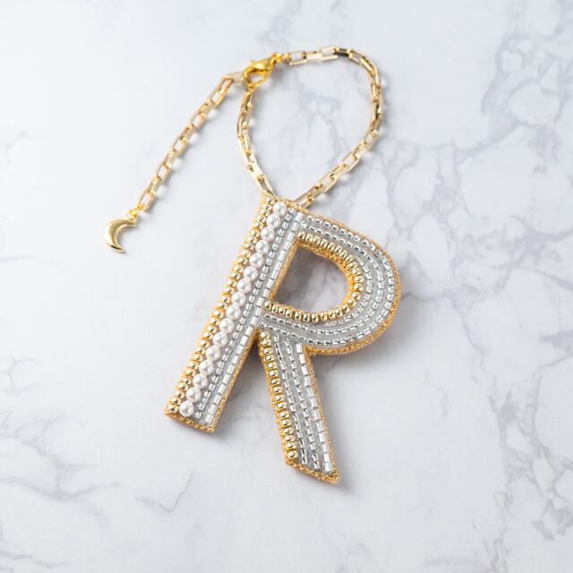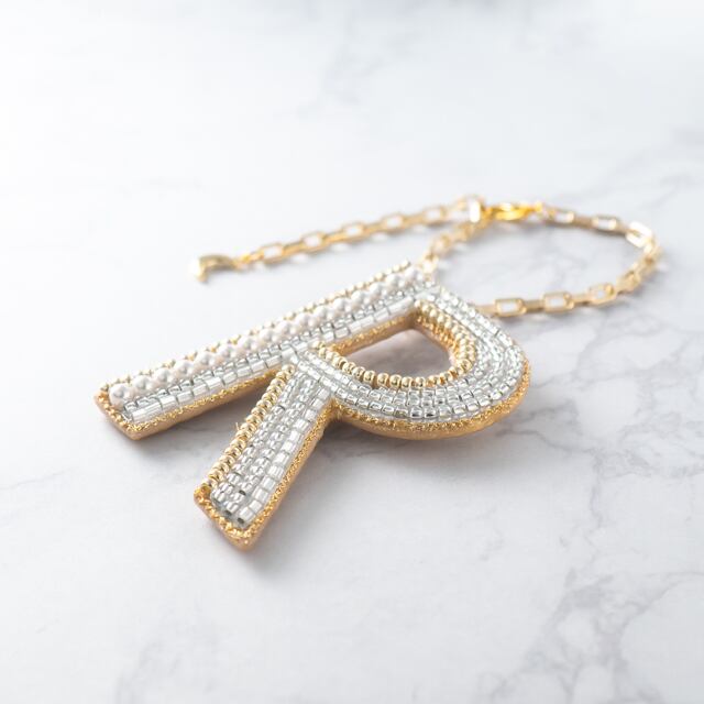 オートクチュールビーズ刺繍の技法で制作した『R』のイニシャルバッグチャームです。